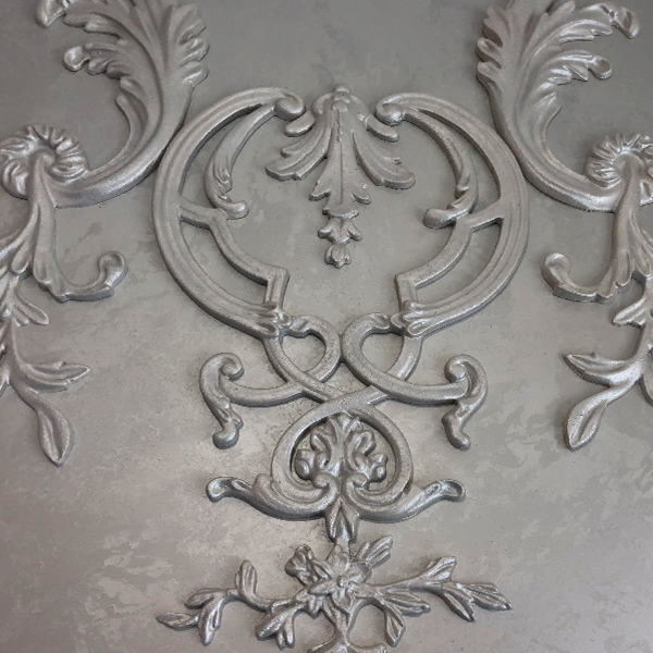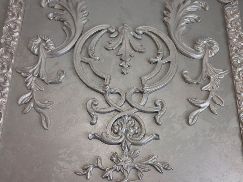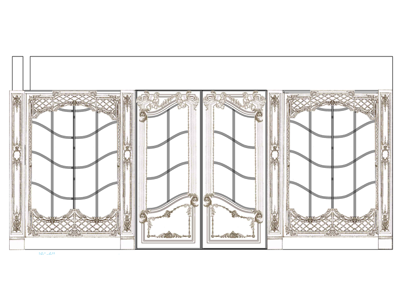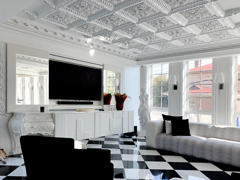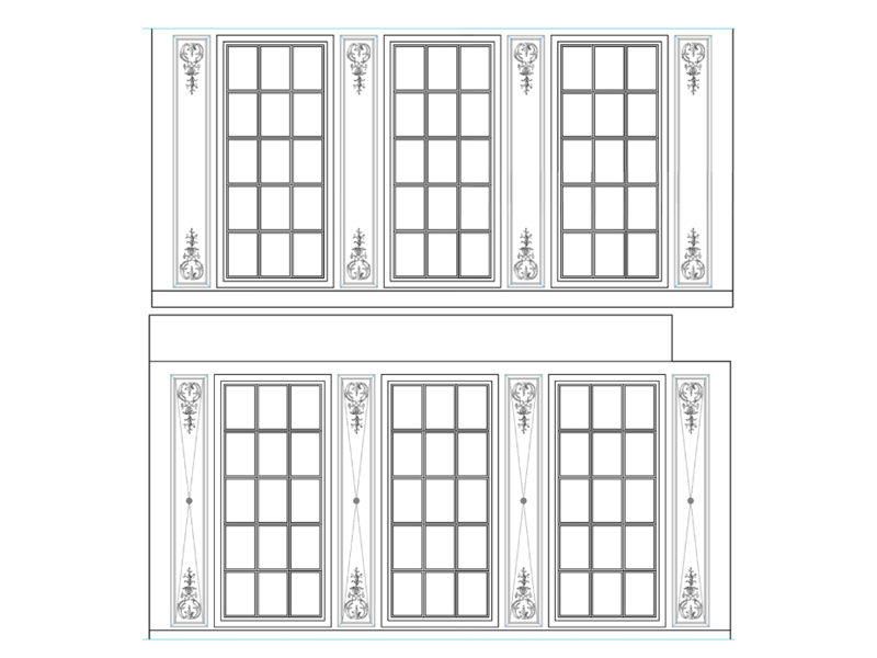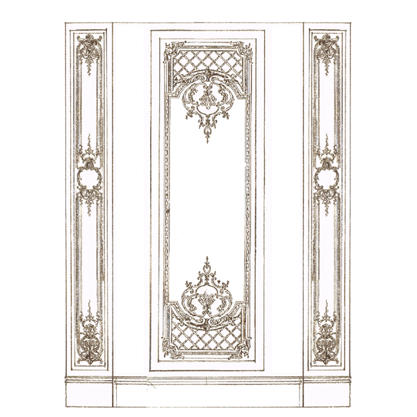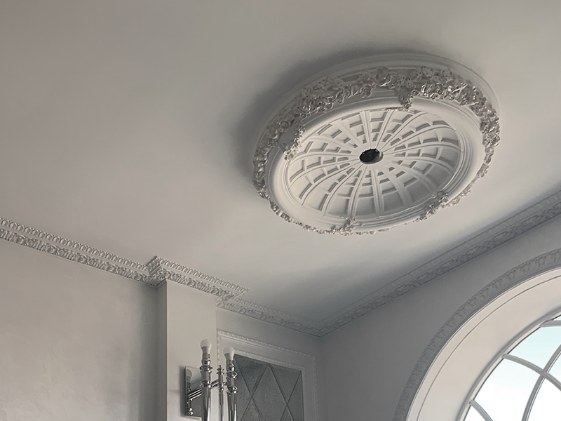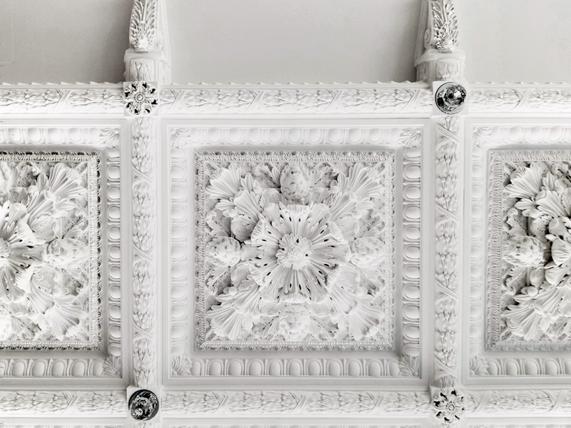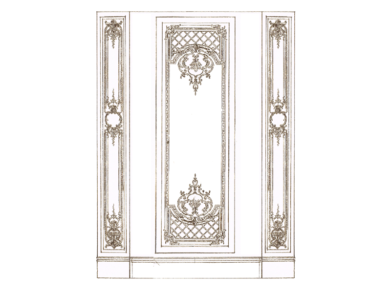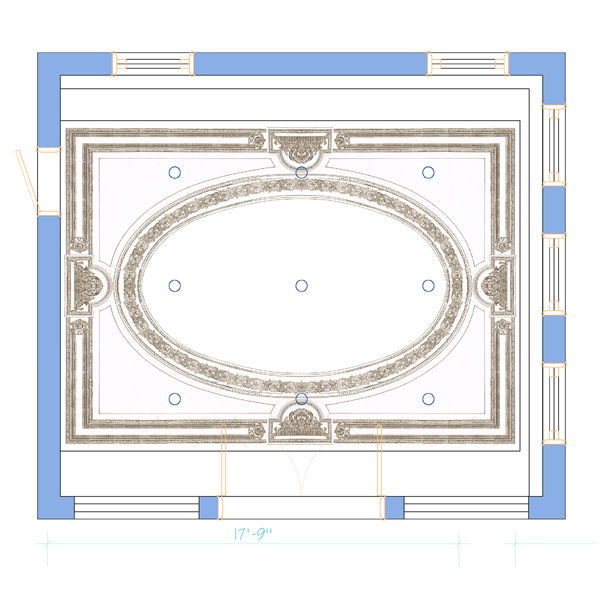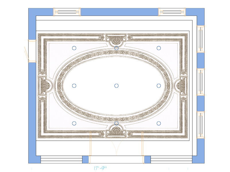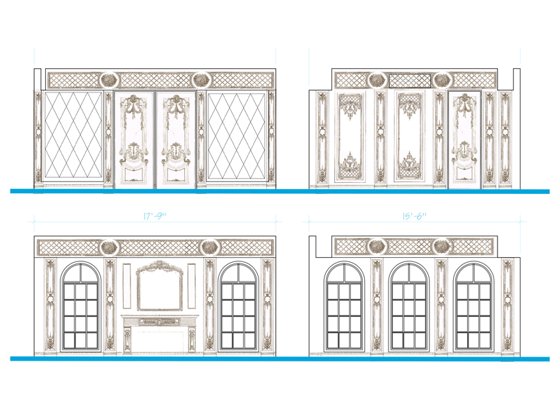 This project presents architectural design blueprints with decorative details, including intricate ceiling designs and ornate wall moldings.