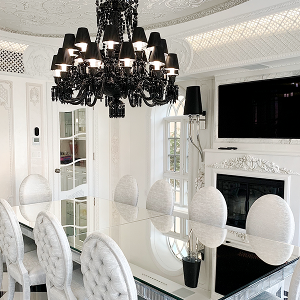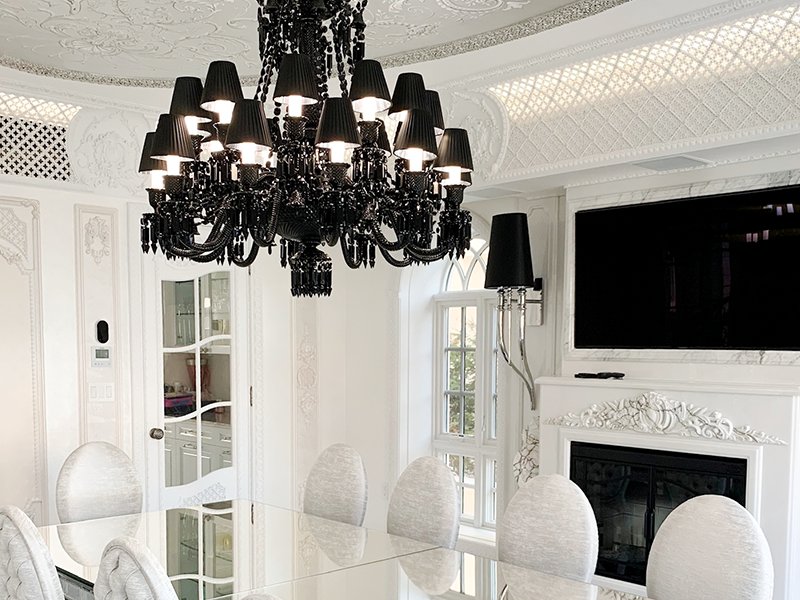 This project showcases elegant interior designs with ornate details, including chandeliers, mirrors, and decorative ceilings.