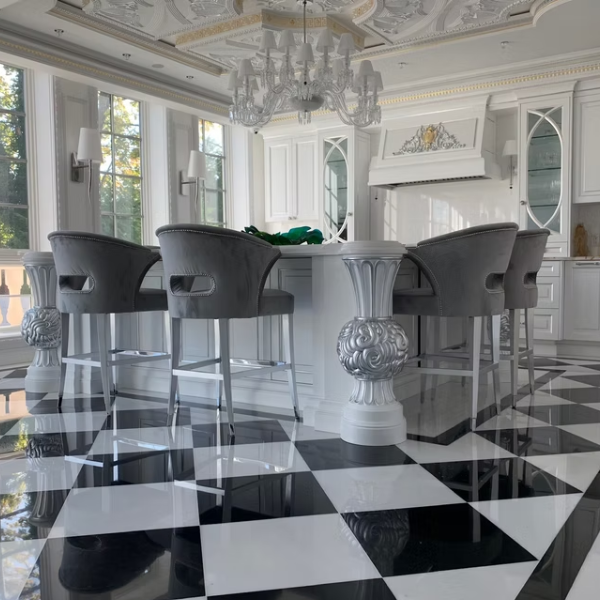 This project features luxurious living spaces with ornate furniture, checkered floors, and decorative ceilings.